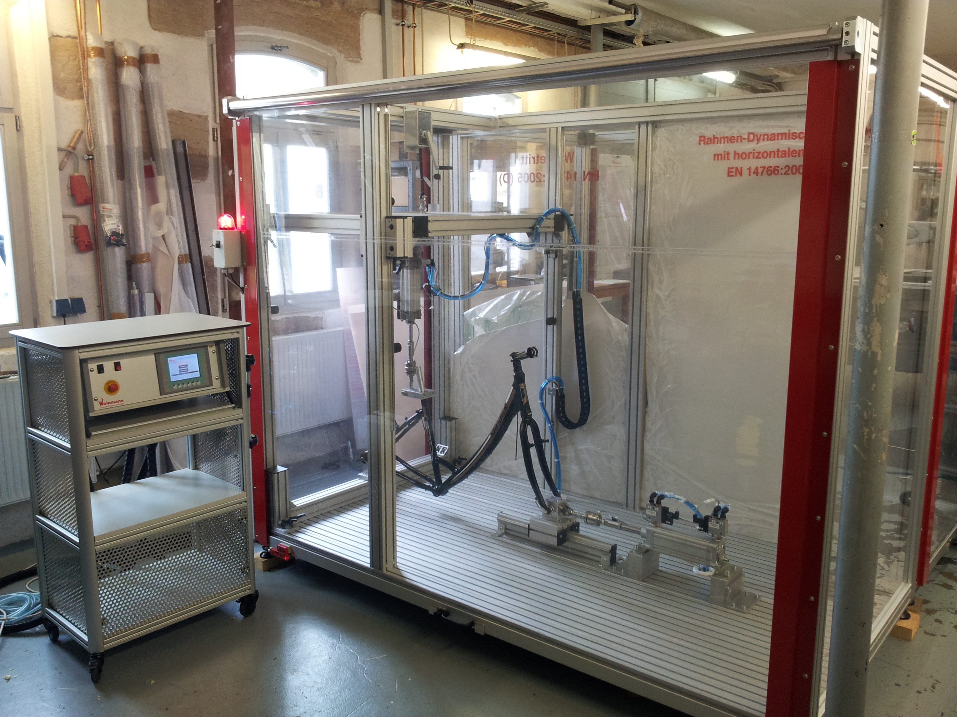 With two height-adjustable, pneumatically force-controlled load axes, including load cells (HBM) for actual force feedback. Handlebar test according ISO 4210 is possible in vertical direction, but not in an angle of 45 degrees.