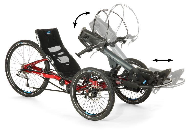 Der Mast verfügt über einen Verstellwinkel von 14°. Die Griffweite kann zwischen 52 und 62 cm variiert werden. Eine weitere Möglichkeit für Anpassungen bieten die flexiblen Sitzsysteme von HP Velotechnik.