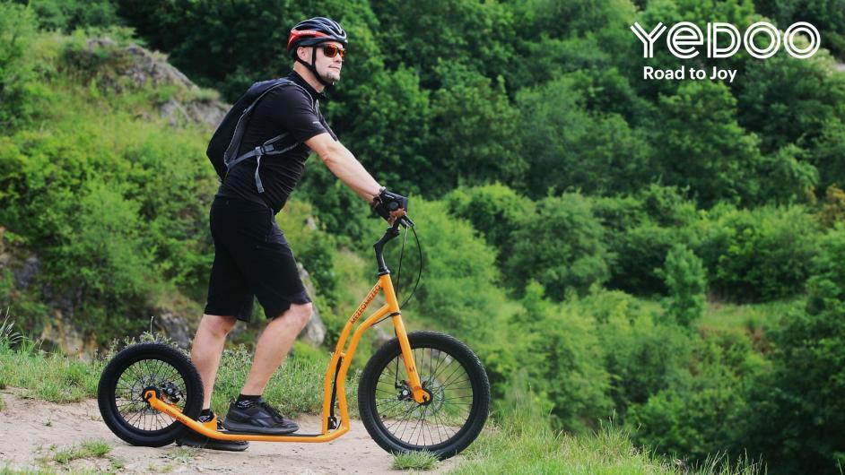 The durable off-road scooter with a solid steel frame can handle anything – roots, mud, dry riverbeds and urban off-road. It has disc brakes on both wheels, wider tyres, an ideal 20”/16” wheel ratio, a practical kickstand and a removable non-slip footboard. Take it on some proper workout and see who can hold out the longest.