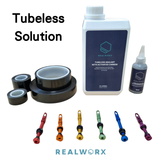 Realworx offers a complete and reliable tubeless solution, including high-quality and colorful valves, our specially formulated tubeless rim tape, and a fast-sealing, long-lasting sealant — designed for anyone who demands performance and convenience.