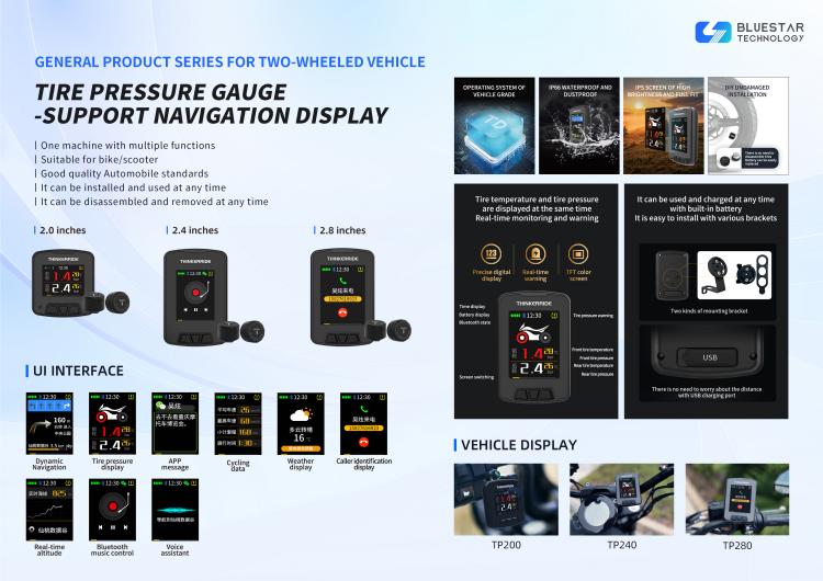 This product is feature-rich and suitable for use during various two-wheeled vehicle rides. It can display the pressure and temperature of the front and rear tires of the vehicle, as well as cycling data, music control, phone message display, real-time weather, Bluetooth dynamic navigation, and it also supports incoming call reminders and displays detailed information about the incoming call.